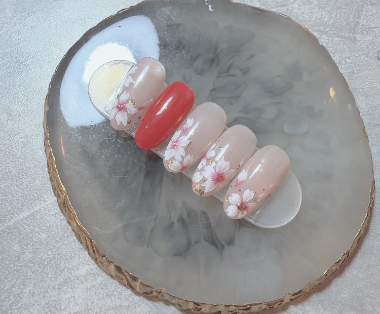 こんにちは🌤️掛川市自爪育成ネイルサロン38nail🐝ミツバチネイルのでぼらです✨自分の爪にやろうかなぁ〜と考案中の桜デザインネイル🌸じゃん✨